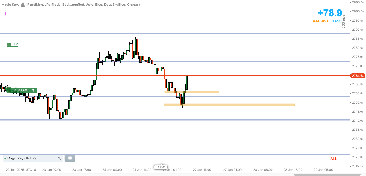 After identifying key support levels, I waited for price action confirmation before entering. The 30-minute timeframe showed a clear bullish structure with higher lows forming. Using Magic Keys for precise execution, I entered a long position when price respected the previous swing low.